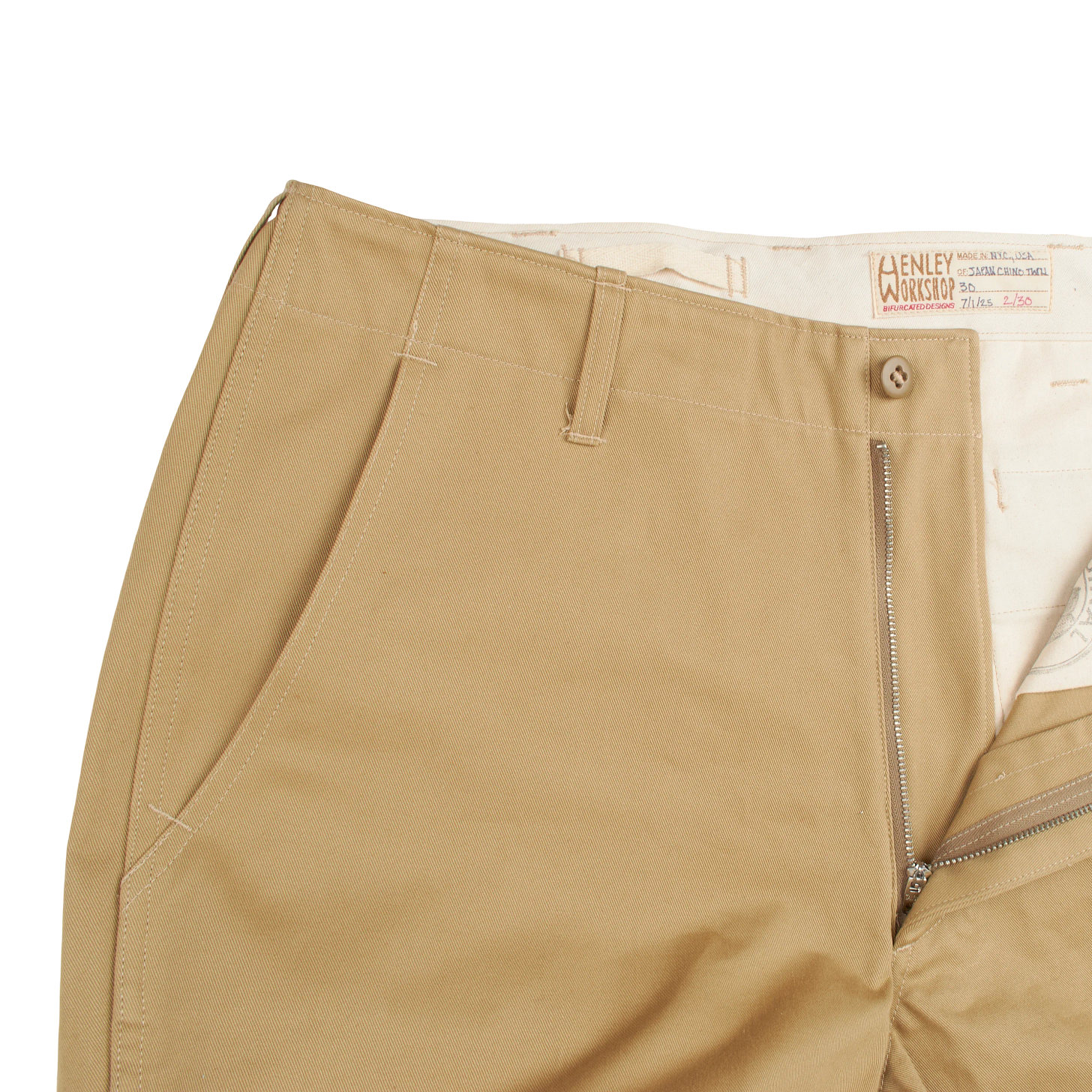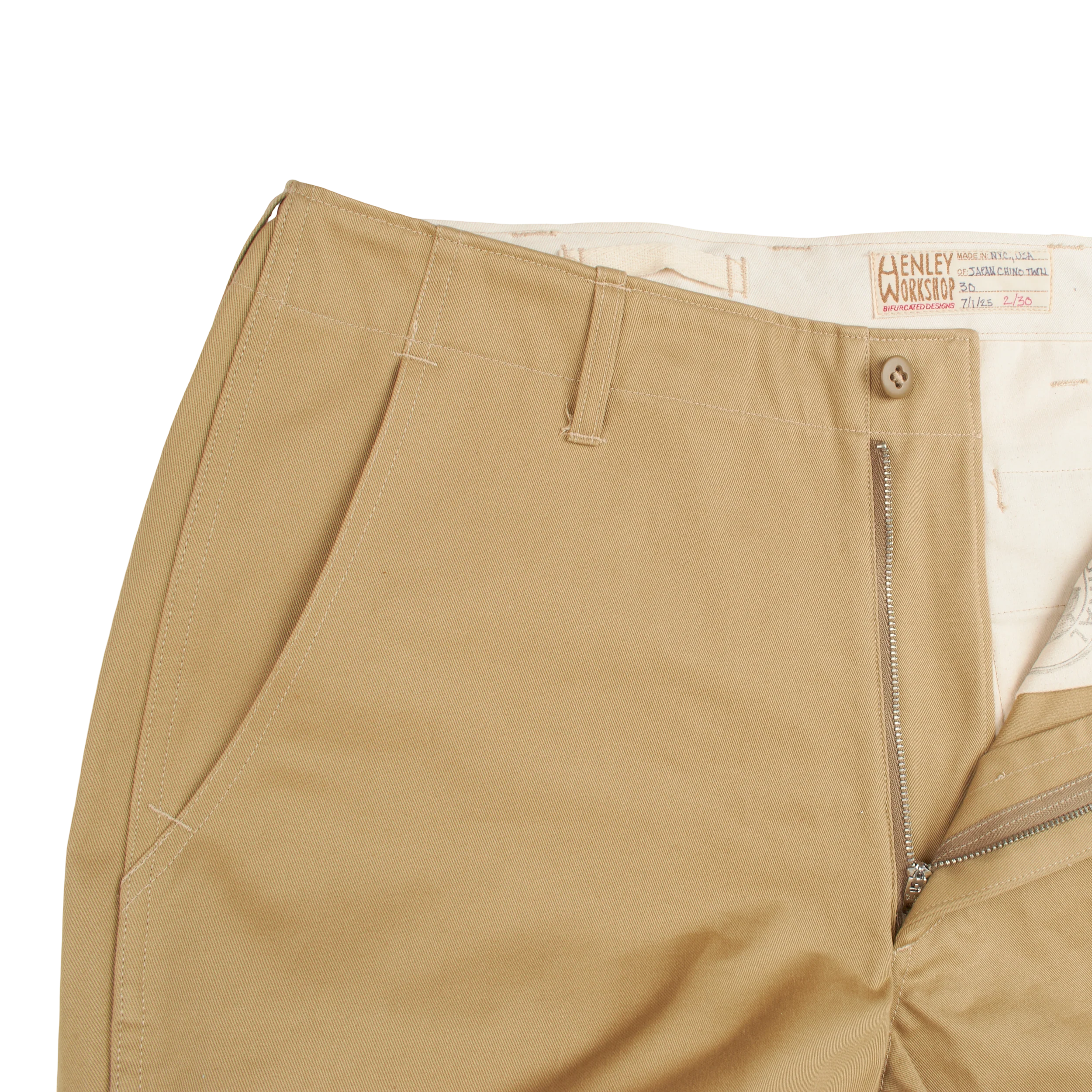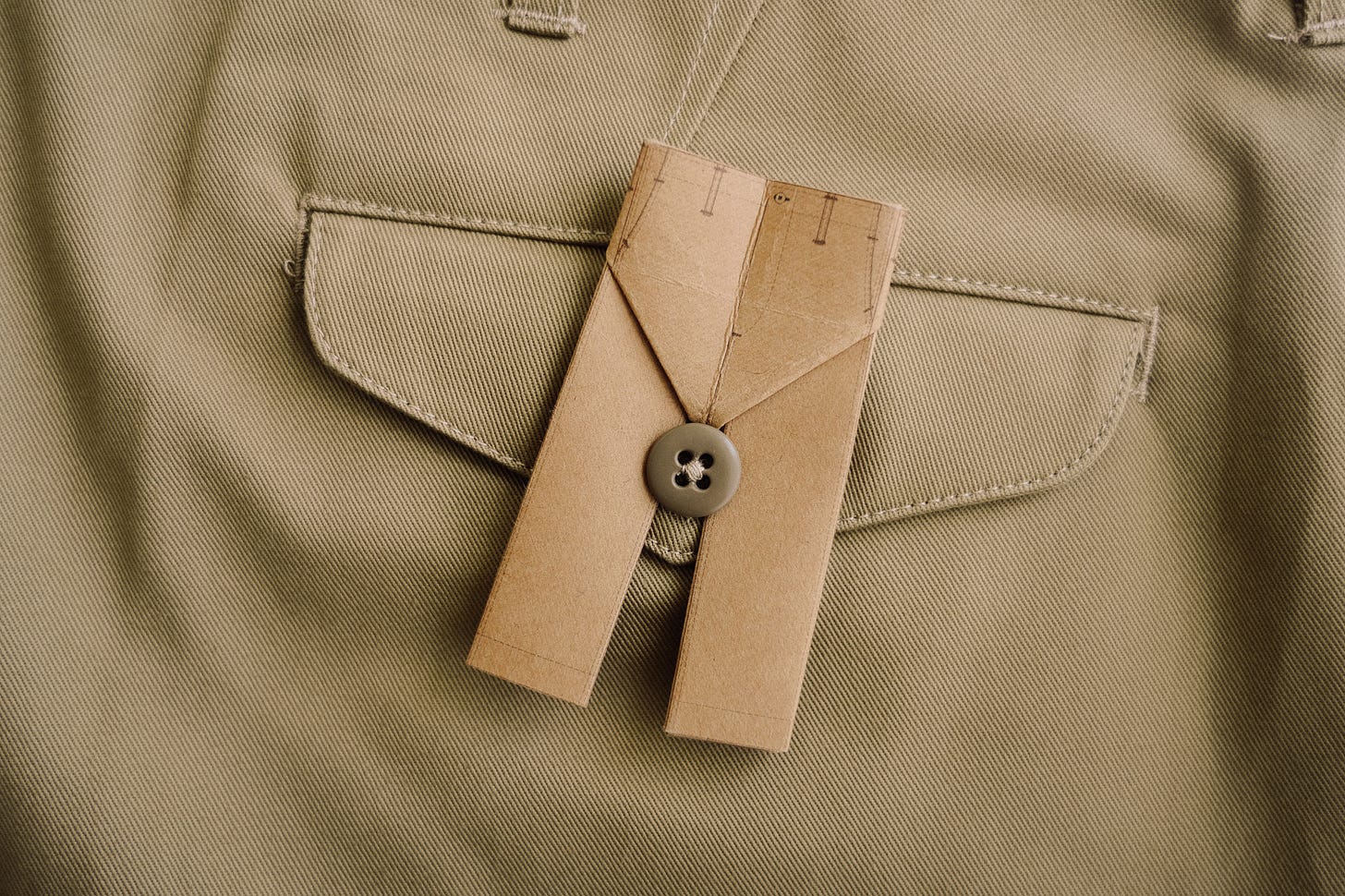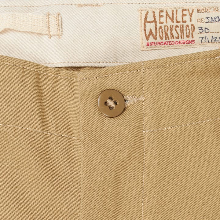 MH: The main inspiration is the original military field chino from the 1940s; for me, that’s the one. Specifically, the one made to the original specifications, which featured flat-felled seams, a grown-on waistband, etc. But I didn’t want to just create a reproduction, so I’ve tried to improve on that without changing the look or spirit of it too much. Updating internal things like clean finishing the fly, doing peached pocket bags, updating the fit, shuttle loom labels, etc. The originals were made en masse and most pretty crudely, though durable. It’s probably kind of ironic to make them in small batches and MTO.