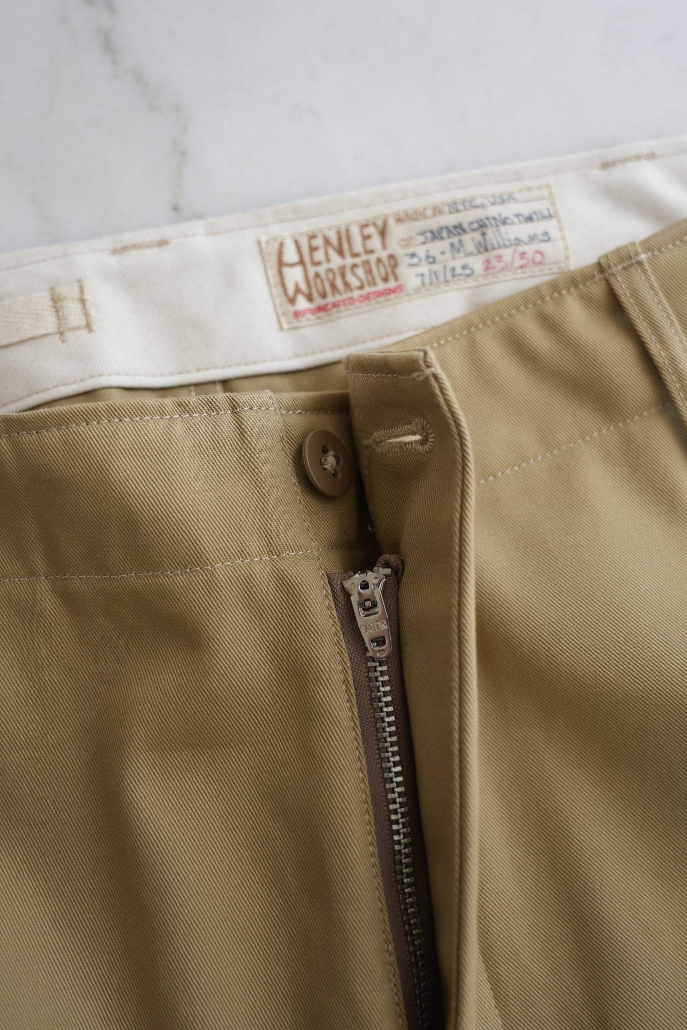 Mark Henley: I guess I’ve just had an affinity for vintage military chinos for a long time. Probably because of their ease, durability, and versatility. There’s something really appealing about their simplicity and universality. With a good pair of chinos and a white t-shirt, you don’t really need to know much else about clothing — it’s a solid foundation to build off of. There’s also a lot to dig into and riff on from a design/making perspective. I’ve always tinkered around with making patterns and samples and always gravitated towards pants, maybe because they feel substantial. I also felt denim, shirts, and most other things are pretty well covered already.